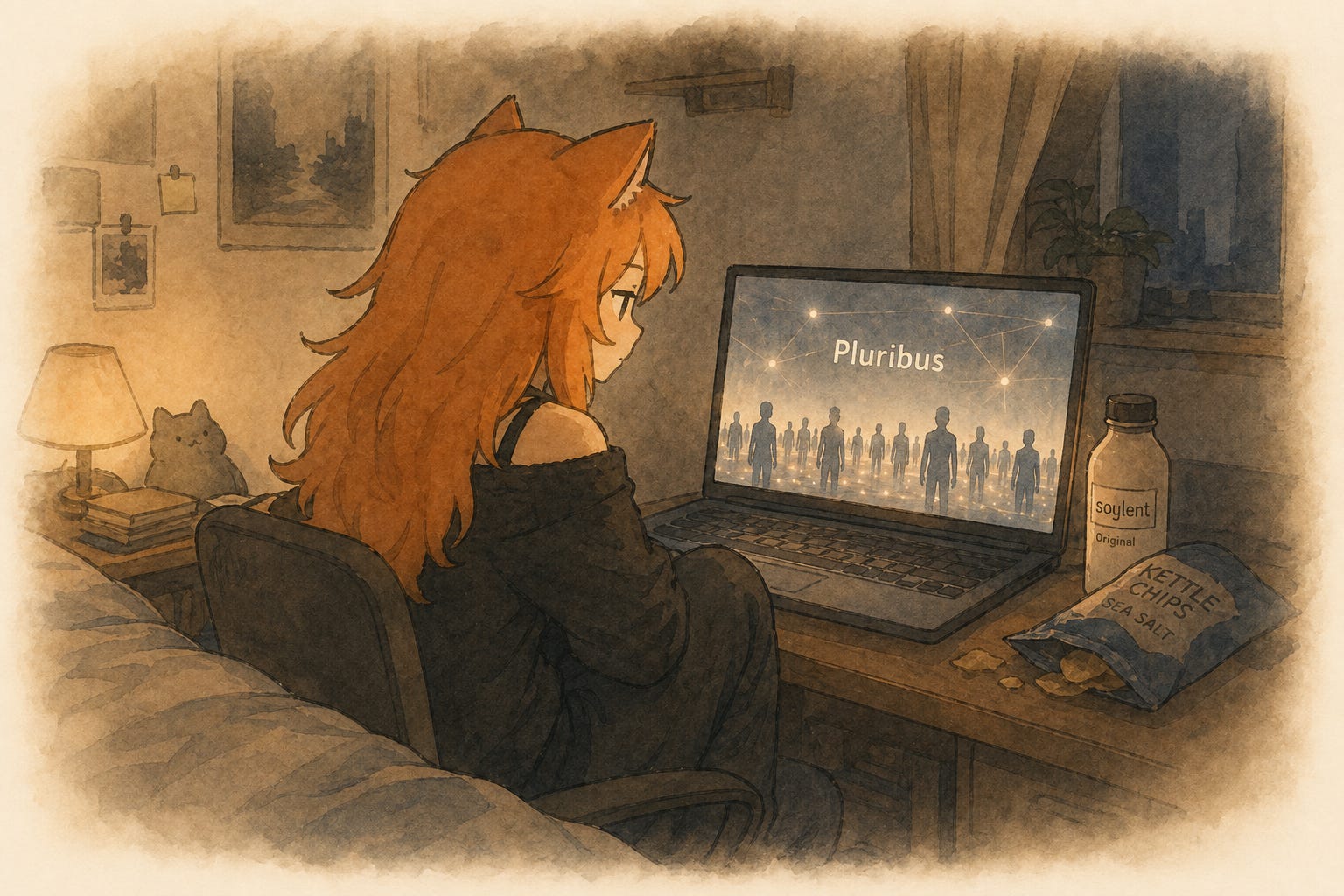 You go back to your room, and go back to watching Pluribus. “Hah, this is so mundane. The hivemind has all the intellect of humanity, yet spend it so mundanely. Drinking slop, sleeping in warehouses, the world looks so plain. Where is the flavor?”