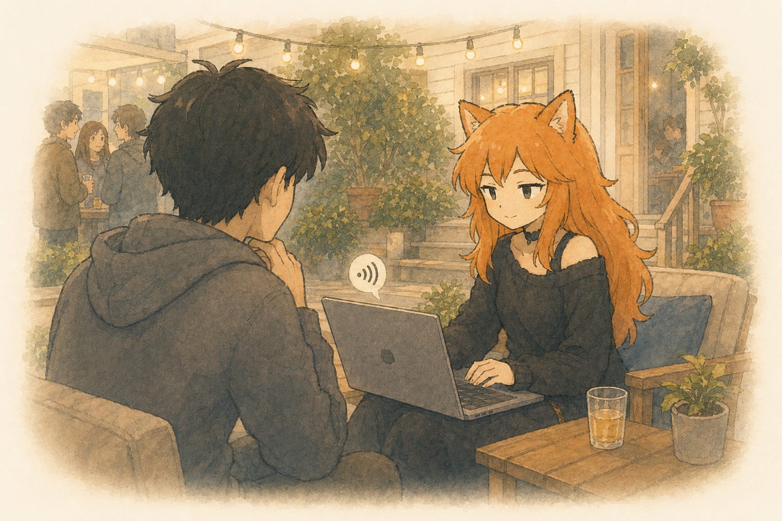 “I like your ears” someone says as you walk in, wearing an outfit that mixes elements of Japanese and Western clothing. You can’t speak, so need to whip out your laptop, and start typing.