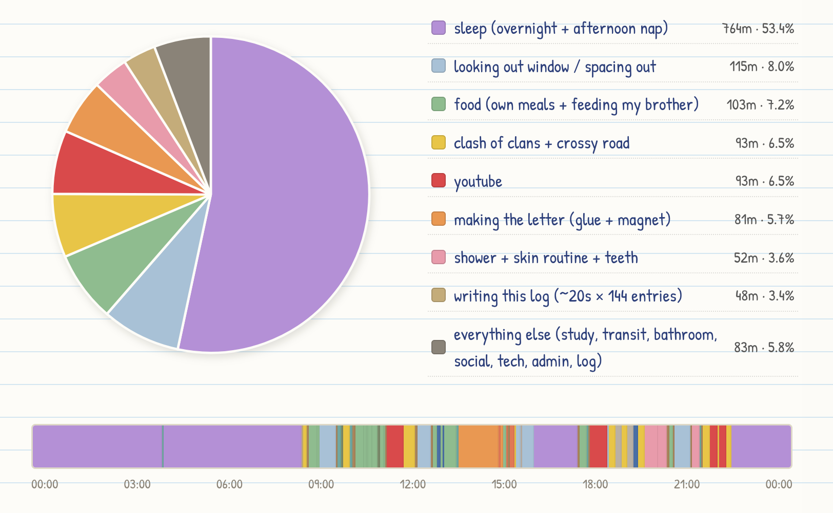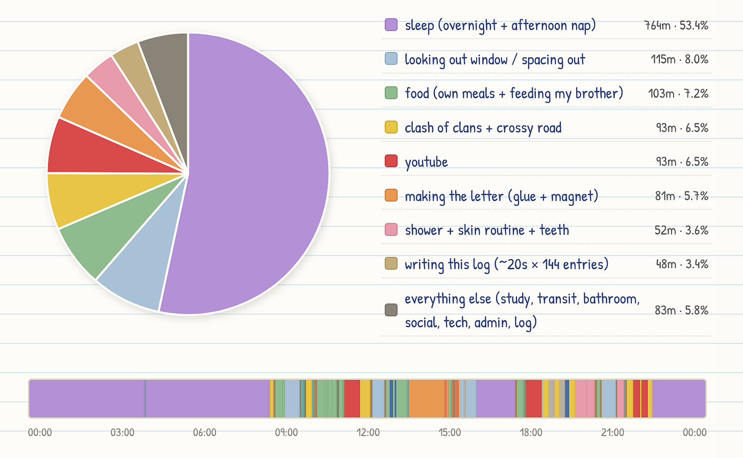 Here is the transcript of what I did in the day. I did not go as far as Celeste and write down every thought. I just wrote in a note every time I was doing something, there was no rigorous methodology. I just decided to do it the day before and stuck to it. I never did it again, I’m not sure why.1